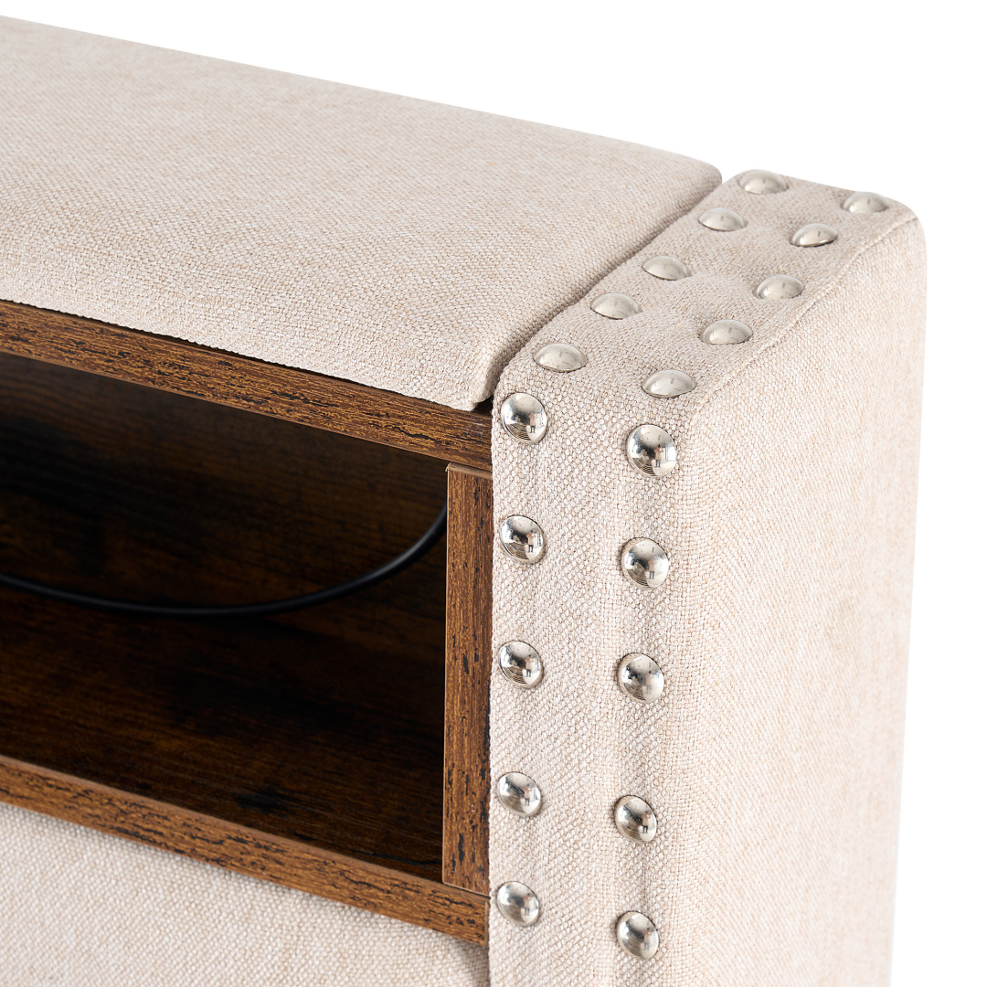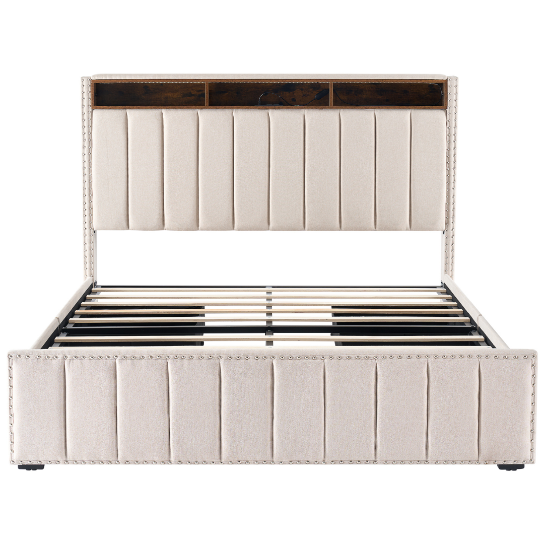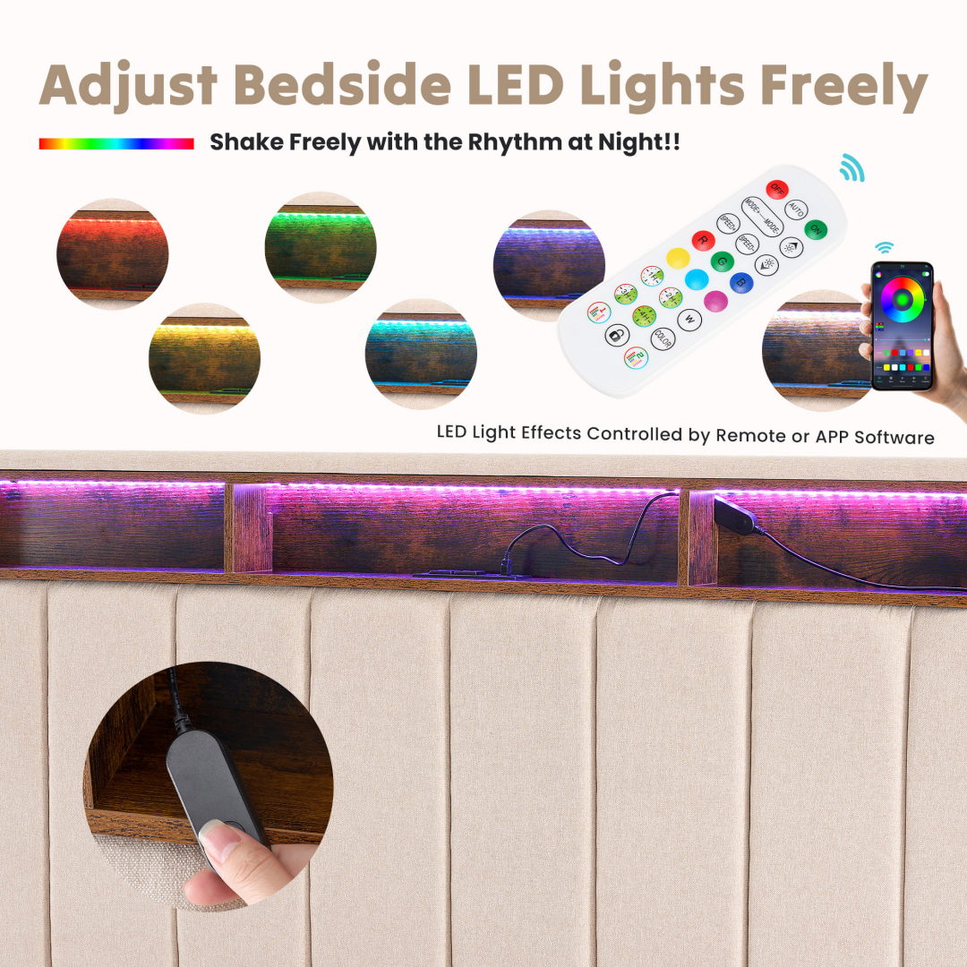 【Storage Headboard with Charging Station】 This upholstered bed frame features a practical storage headboard with a built-in charging station, offering convenient access to power for your devices. Keep your phone, lamp, or other items within easy reach.Dimensions Package Dimensions Product Weight Package Weight Product Code Style 63.39 x 21.26 x 6.50 inch 63.38 x 21.26 x 6.49 inch 100.09 lb 108.24 lb ZHUMI-RBC-2D4BC-Q-BG QUEEN 56.69 x 21.26 x 6.30 inch 56.69 x 21.26 x 6.29 inch 96.12 lb 103.83 lb ZHUMI-RBC-2D4BC-F-BG FULL - 【Customizable RGB LED Lighting】 The integrated RGB LED lighting allows you to adjust colors and modes freely. Use the included remote control or mobile app to create a cozy and stylish bedroom atmosphere.